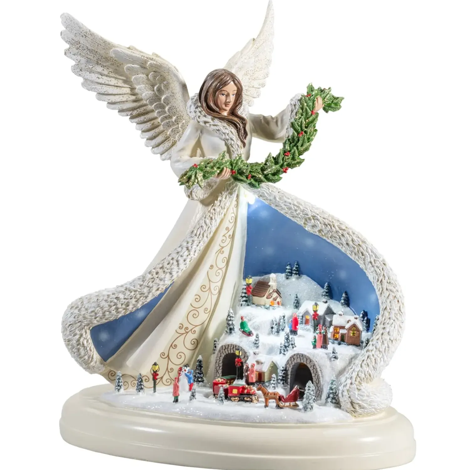 Schutzend Breitet Der Engel Seinen Weisen Mantel Uber Die Winterliche Berglandschaft Und Seine Bewohner. In Der Winterlichen Szenerie Gibt Vieles Zu Entdecken Und Zu Bestaunen. Unter Dem Winterdorf Fahrt Der Kleine Zug Um Durch Einen Bergtunnel Im Kreis.