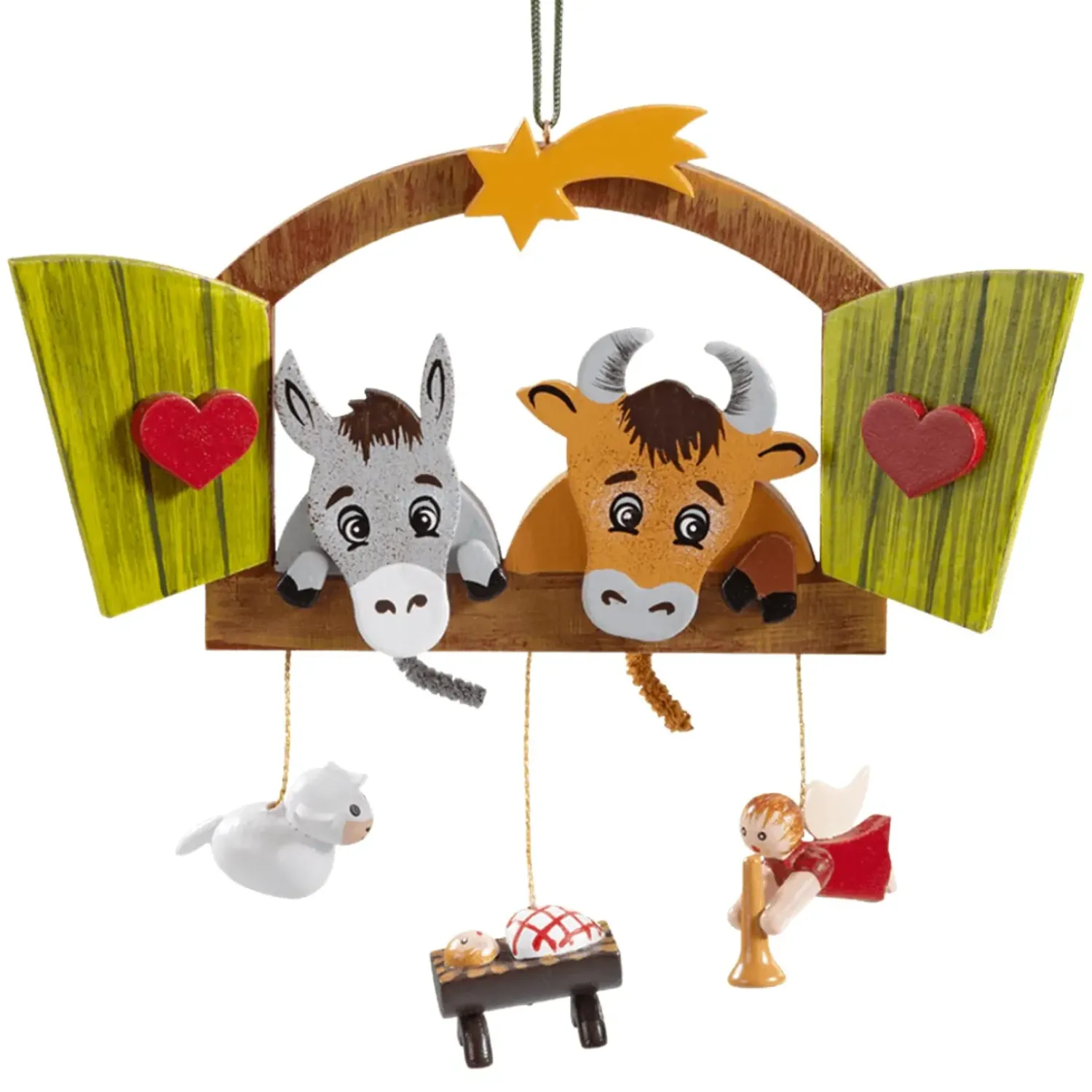 Zu Weihnachten Durfen Sie In Keiner Krippe Fehlen: Ochs Und Esel Neben Dem Jesuskind. Die Drolligen Tiere Betrachten Sinnbildlich Das Neugeborene Jesuskind Durch Das Fenster Des Stalles. An Dem Krippenfenster Baumeln Noch Ein Weises Schafchen Und Der Verkundigungsengel. Diese Liebevoll Und Etwas Verspielt Gestaltete Szene Der Weihnachtsgeschichte Wird Sie Bezaubern!