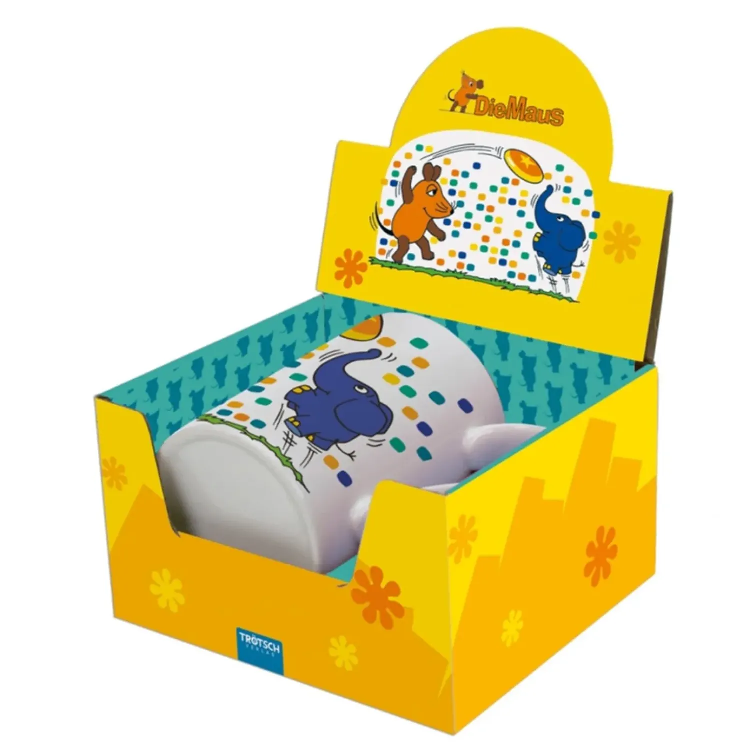 Farbenfrohe Tasse Mit Der Maus Und Dem Elefanten Aus Der Bekannten Tv-Serie „Die Sendung Mit Der Maus“