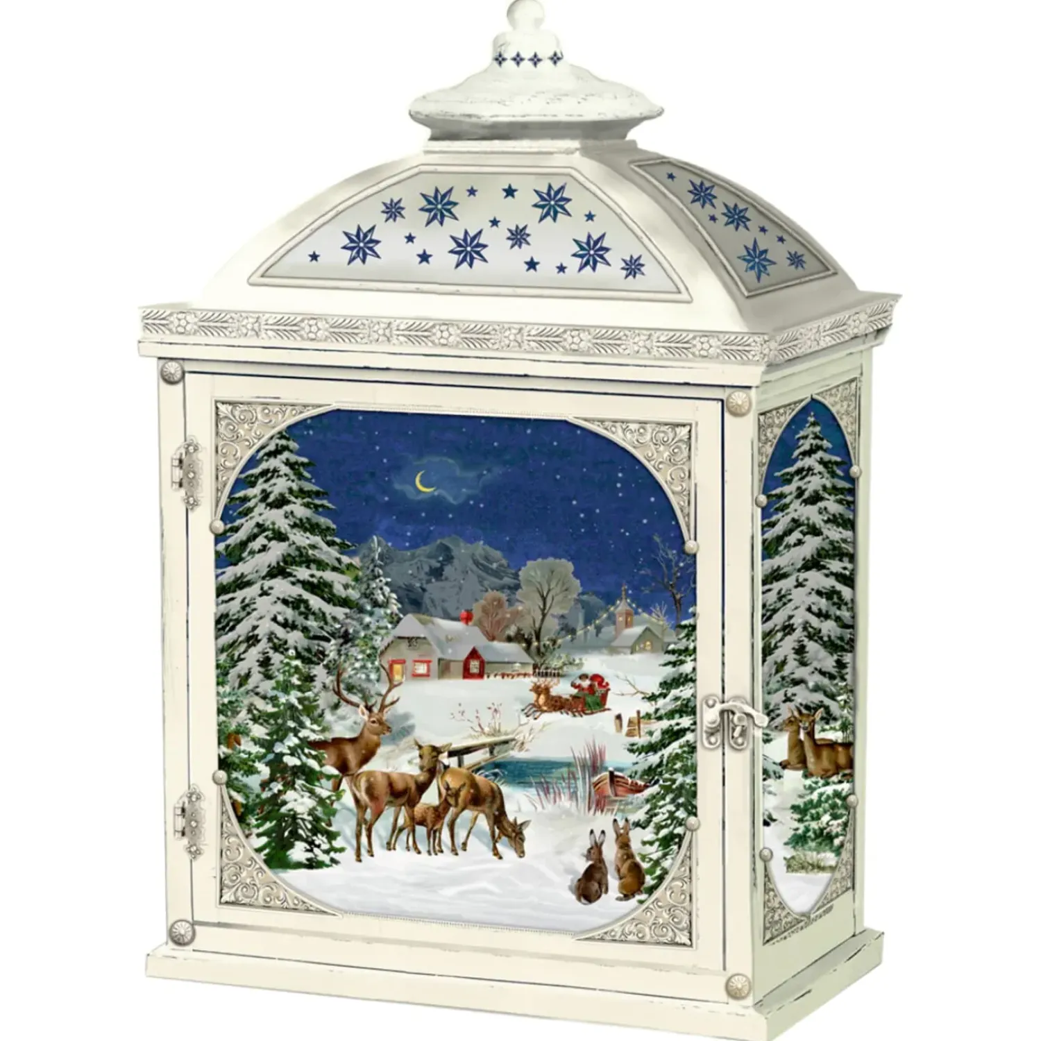 Tauschend Echt Wirkt Diese Laterne Aus Papier! Die Laterne Umrahmt Eine Stimmungsvolle Winterszenerie. Am Kleinen See, Abseits Des Weihnachtlichen Treibens In Der Stadt Freuen Sich Die Die Tiere Des Waldes Uber Den Besuch Des Weihnachtsmannes.