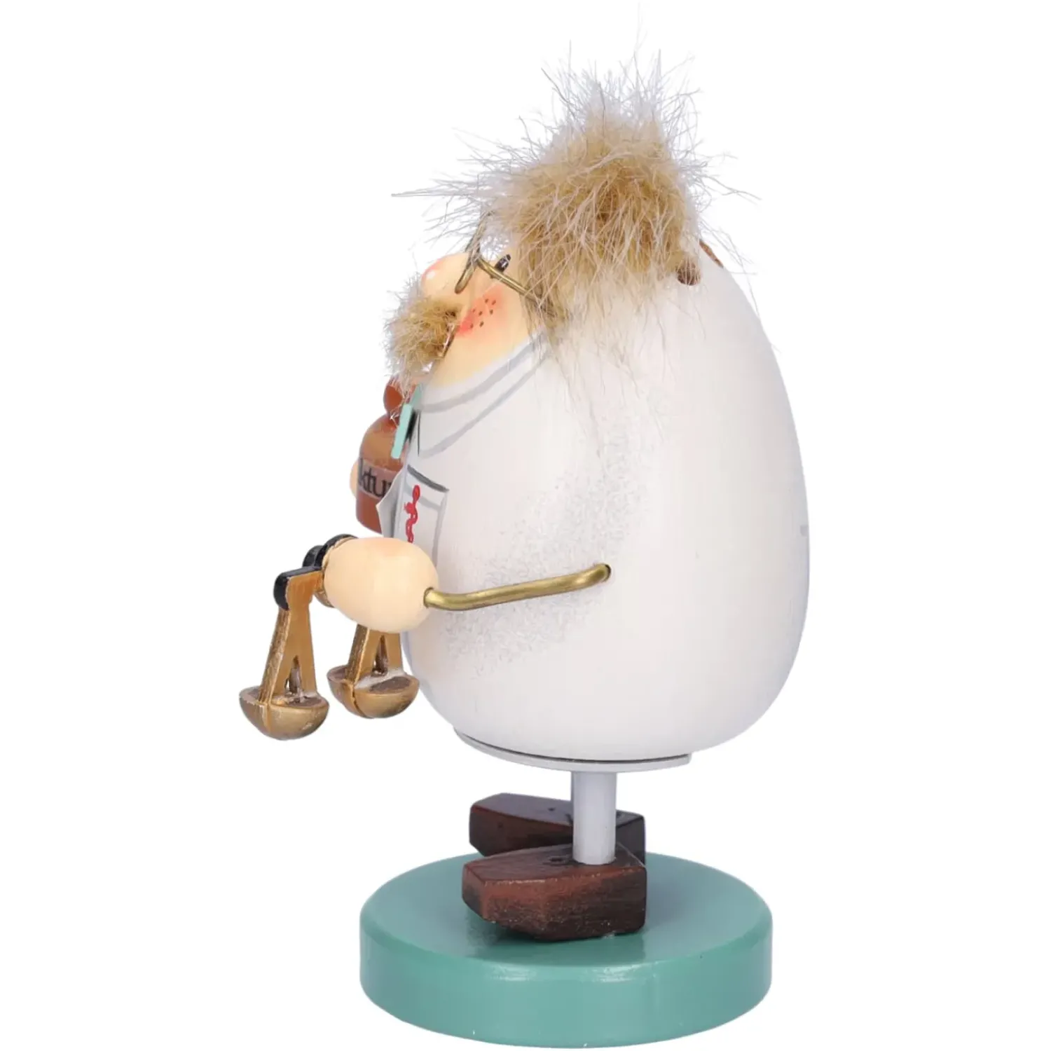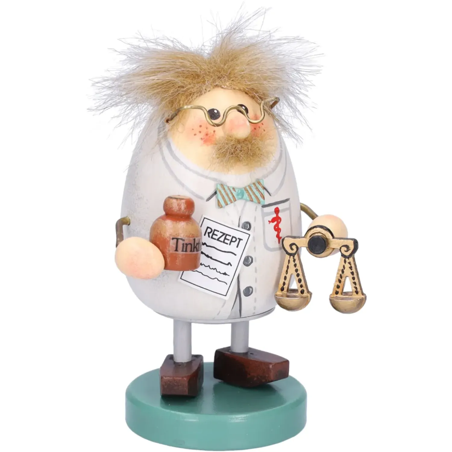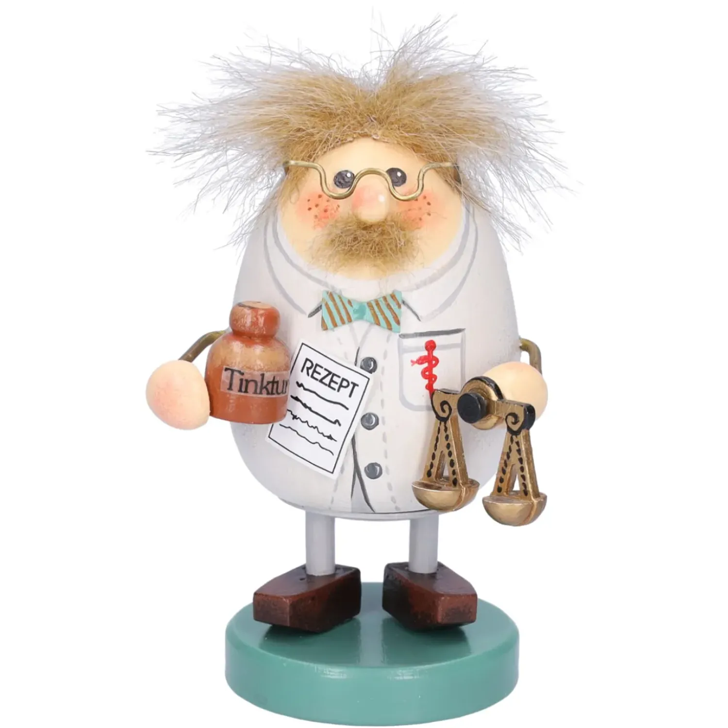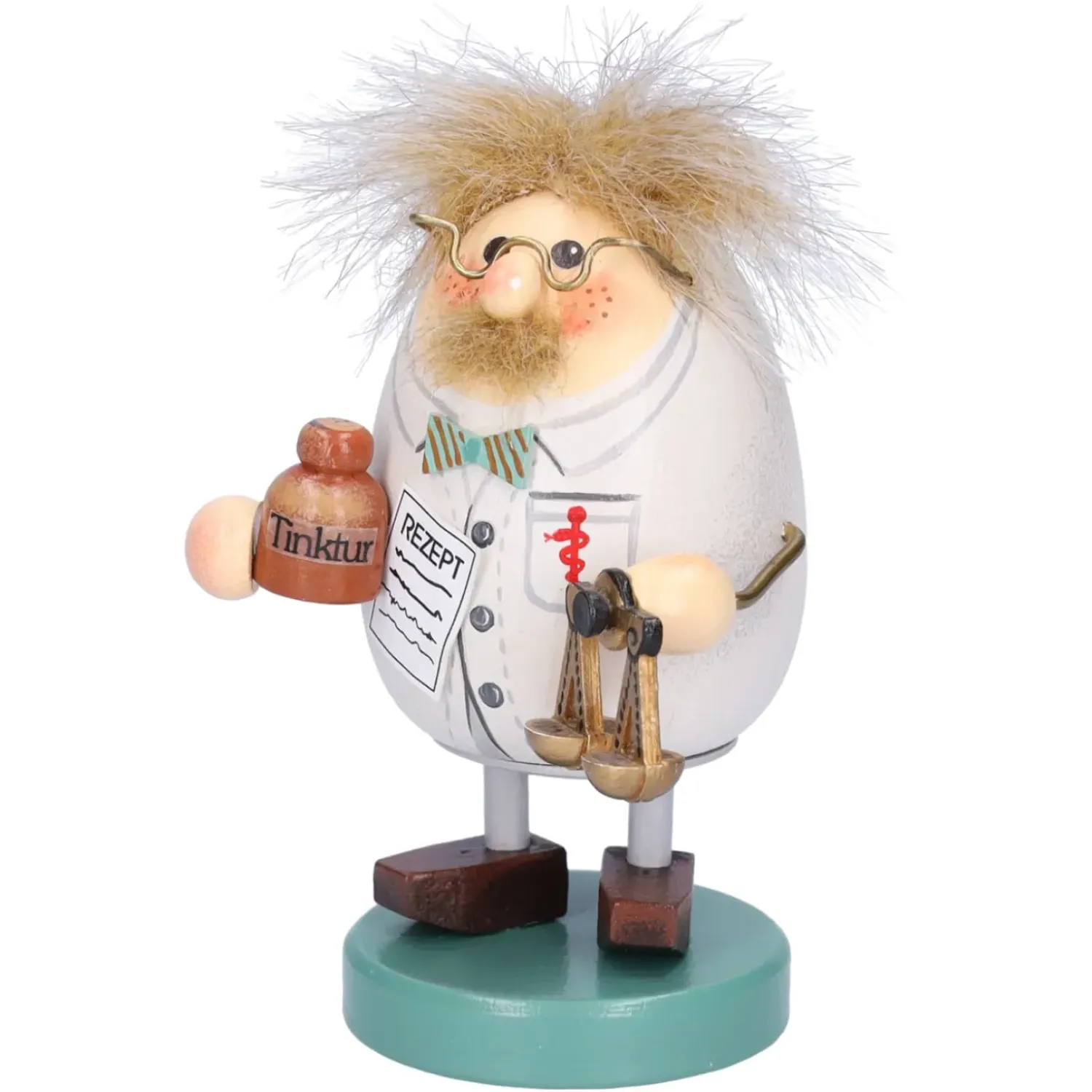 Er Ist In Seinen Weisen Apothekermantel Gehullt Und Tragt Dazu Eine Frohlich Bunte Fliege. Die Goldene Lesebrille Und Die Roten Backchen, Geben Ihm Ein Herzliches Und Freundliches Aussehen.