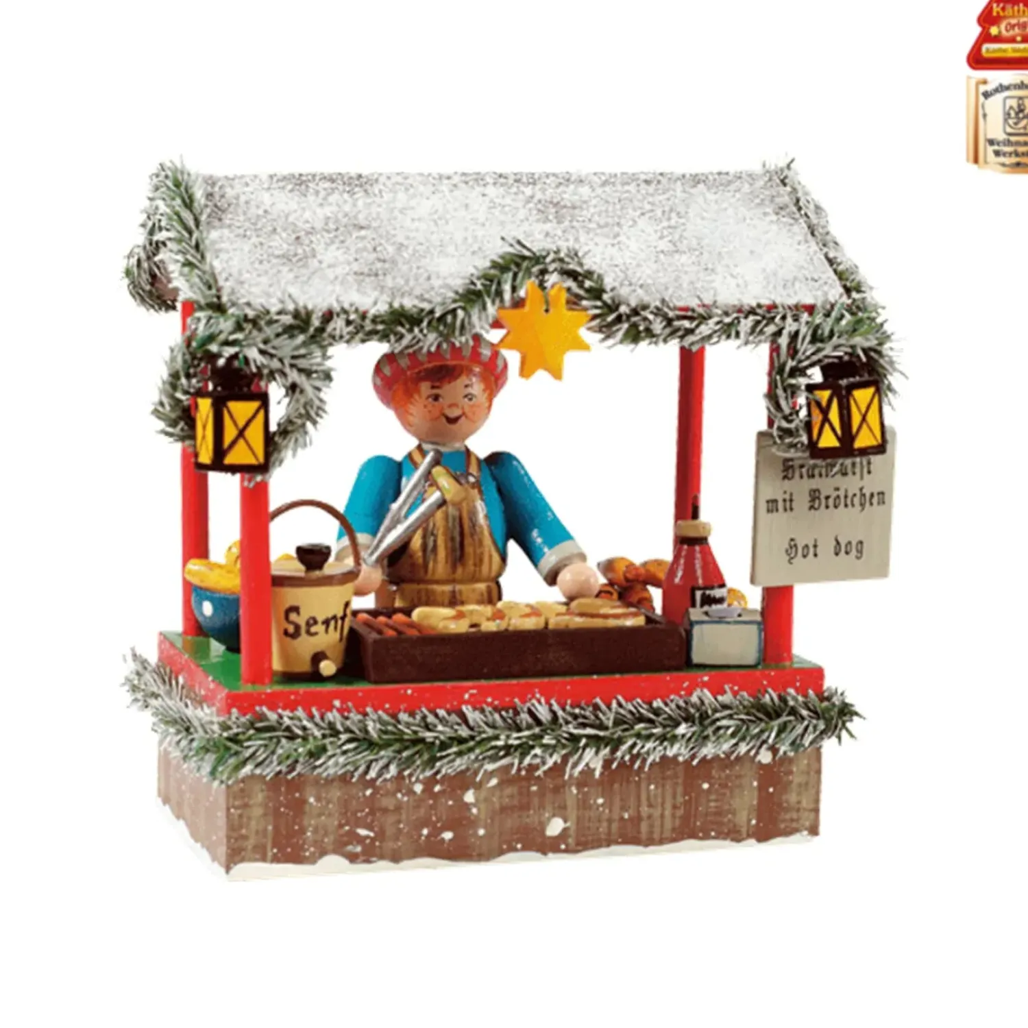 Der Duft Von Frisch Gebratenen Bratwursten Durchstromt Die Gassen Des Kleinen Weihnachtsmarktes. Gerne Machen Die Besucher Des Marktes Bei Gluhwein Und Bratwurst Eine Kleine Pause. Der Fleisige Handler Ist Schon Dabei Die Nachste Wurst Ins Brotchen Zu Legen. Der Nachste Bitte! Wie Essen Sie Ihre Wurst? Mit Senf Oder Ketchup? Der Kleine Bratwurststand Ist Weihnachtlich Mit Grunen Tannengirlanden Und Kranzen Geschmuckt.