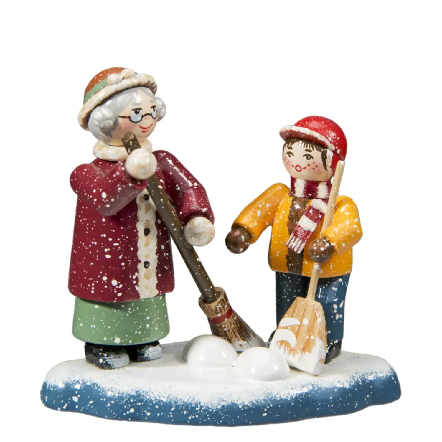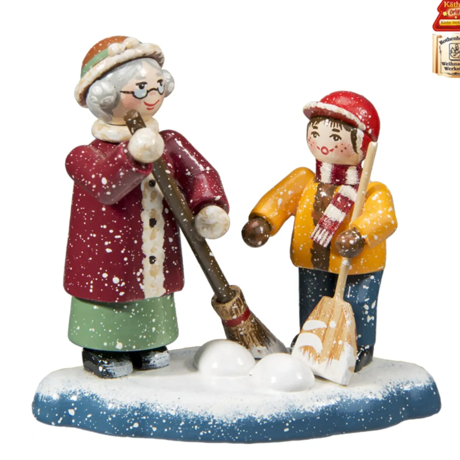 In Einen Warmen Roten Mantel Gehullt, Greift Die Altere Dame Zum Besen Um Die Gehwege Im Winterlichen Dorf Von Schnee Zu Befreien. Freudig Und Voller Tatendrang Kommt Ihr Der Junge Mit Dem Gelben Anorak Zur Hilfe. Was Fur Eine Schone Geste Des Fleisigen Buben Mit Der Schneeschaufel! Die Szene Des Gemeinsamen Schneeraumens Ist Eine Wundervolle Erganzung Ihres Weihnachtsdorfes!