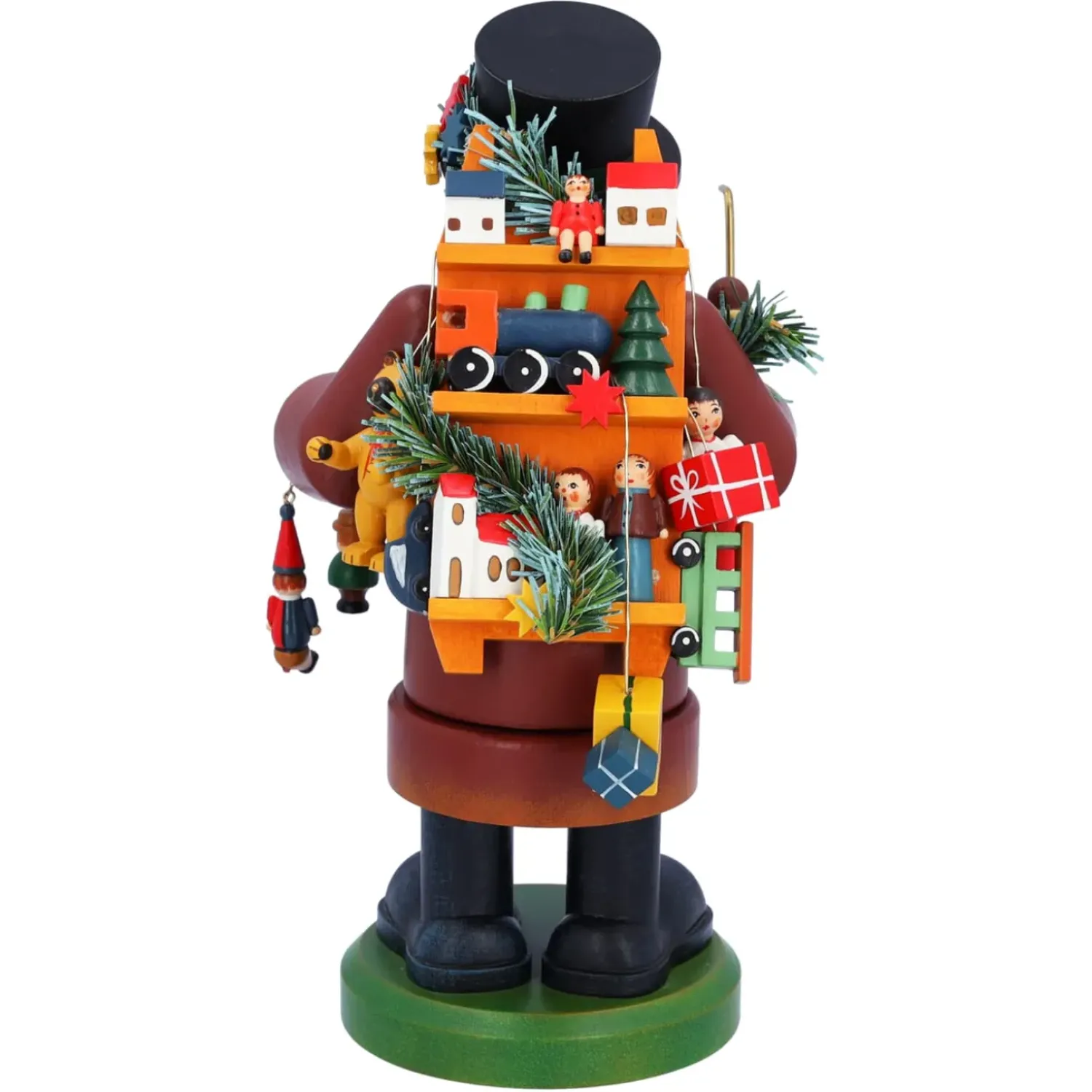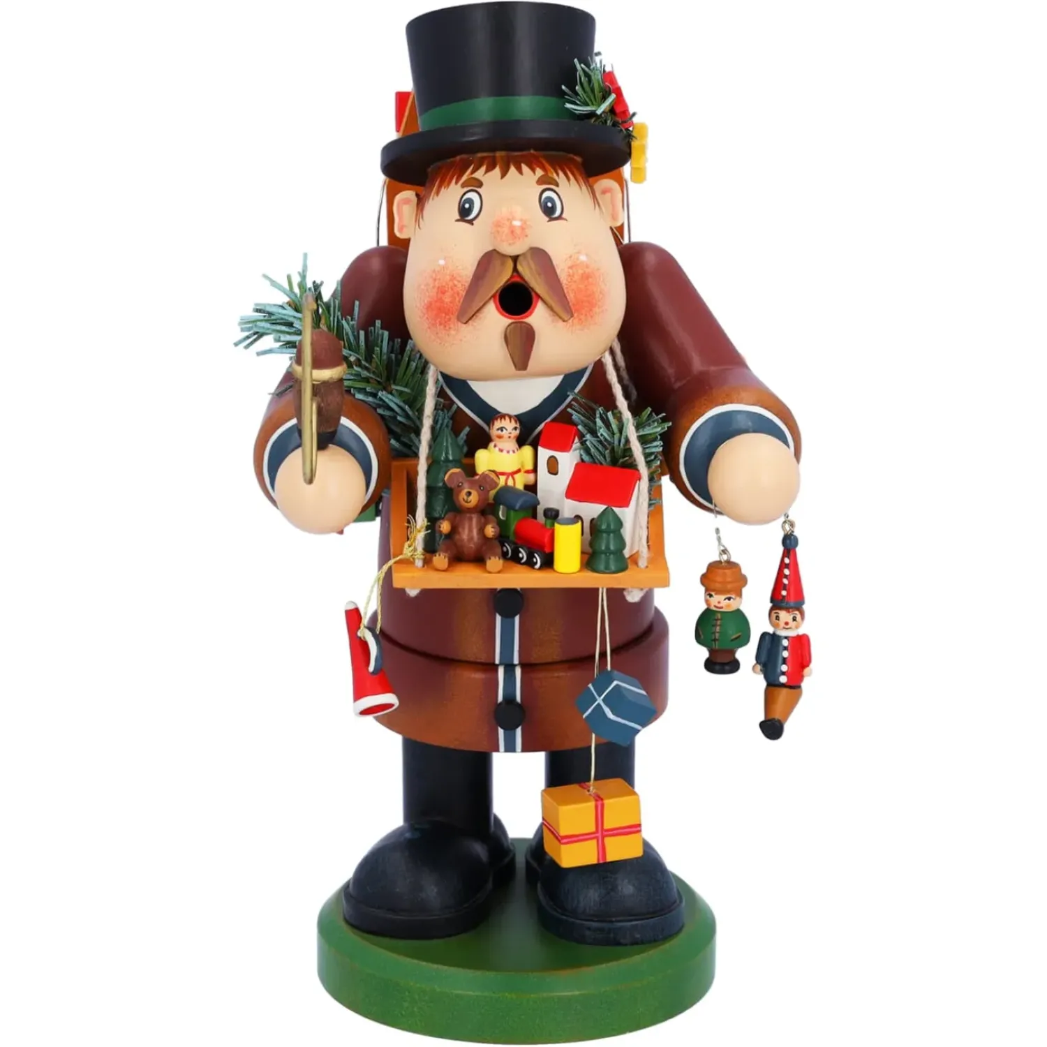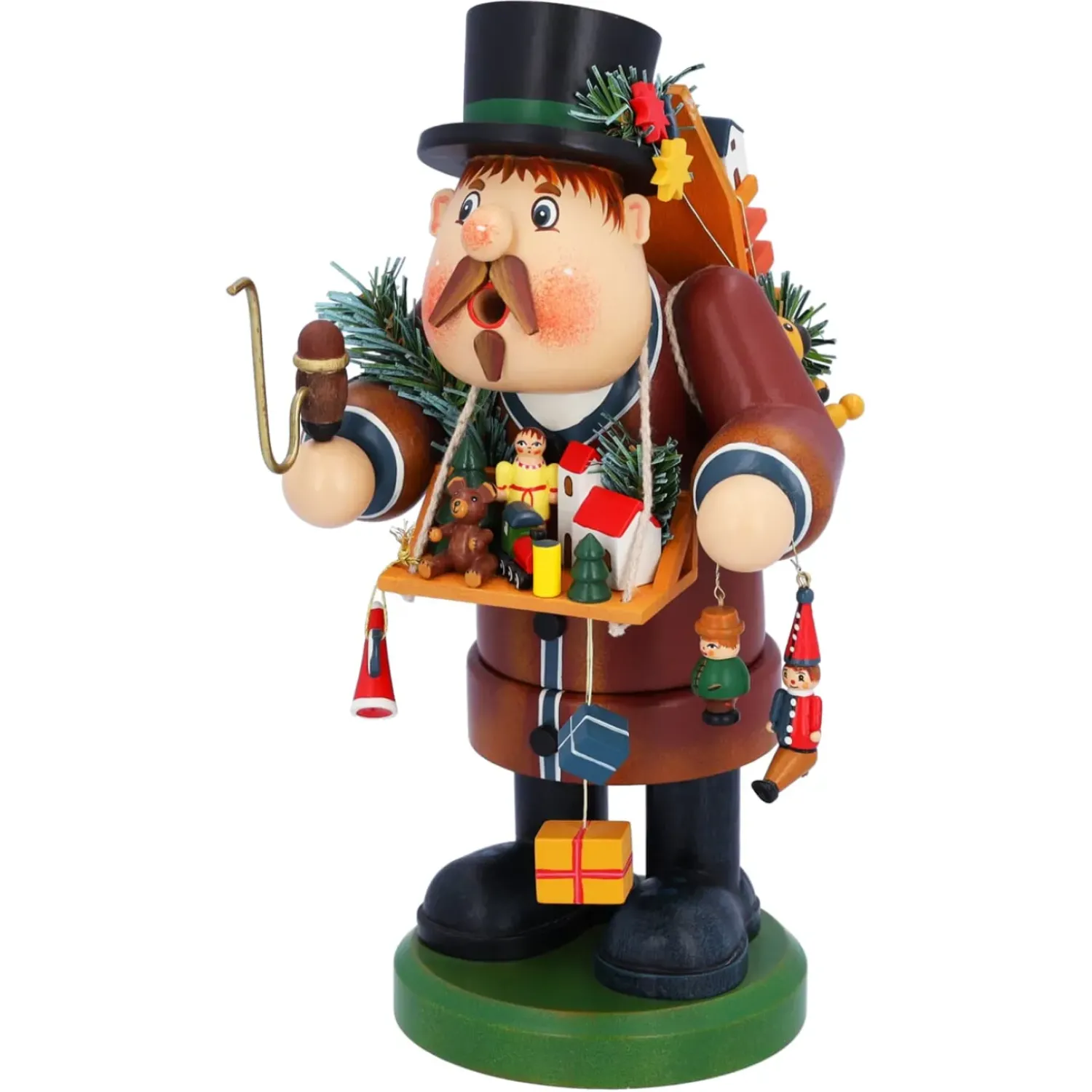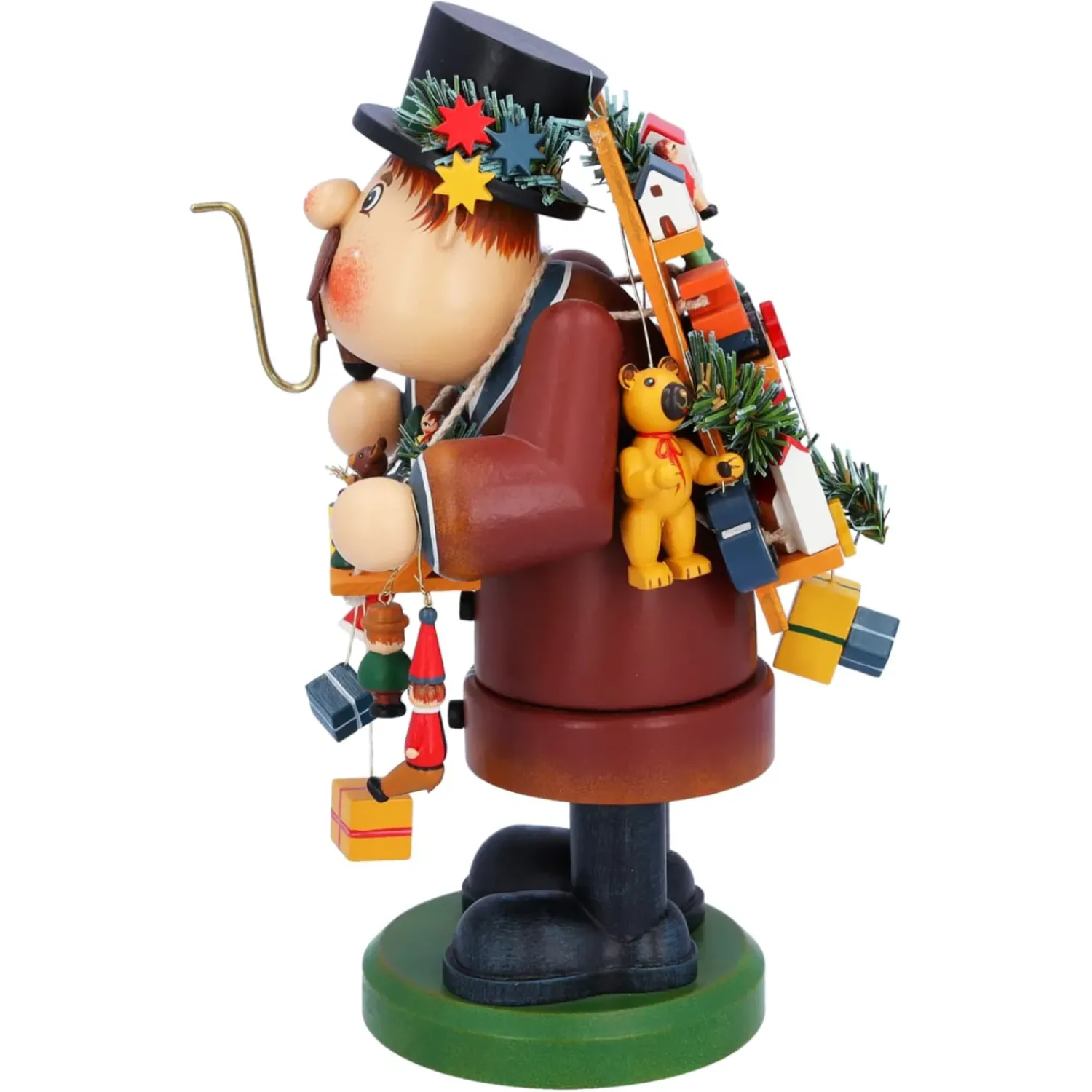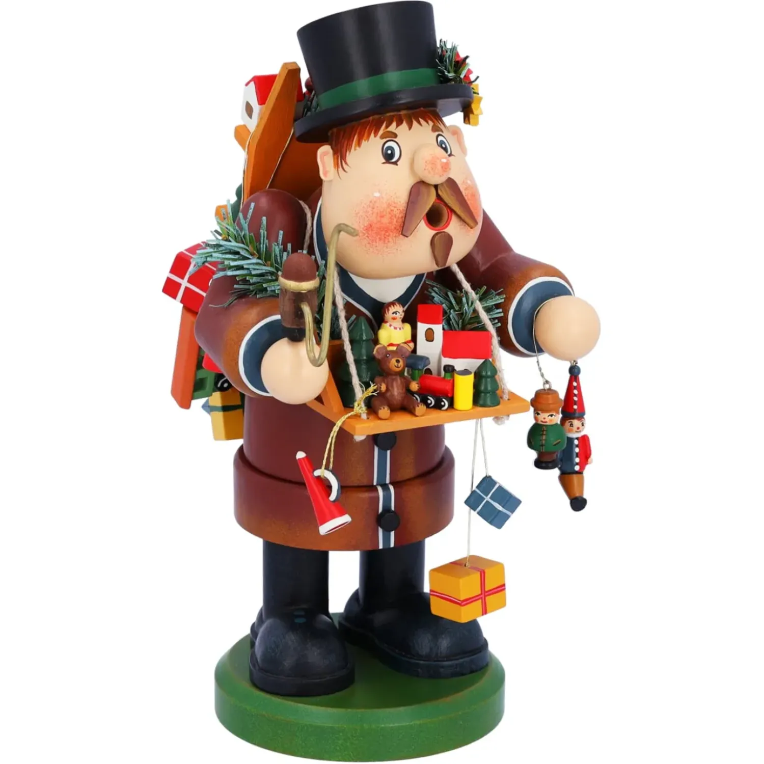 Der Knuffige Spielzeughandler Tragt Einen Schwarzen Hut Und Einen Braunen Mantel Und Ist Eine Echte Augenweite. In Seinem Bauchladen Prasentiert Er Die Schonsten Spielzeuge. Musikinstrumente, Teddybaren, Puppen Und Weiteres Schones Spielzeug Baumelt An Ihn Herunter. Auf Seinen Starken Rucken Tragt Er Noch Weitere Ware Und Aus Seiner Pfeife Stromt Ein Wunderbarer Raucherduft.