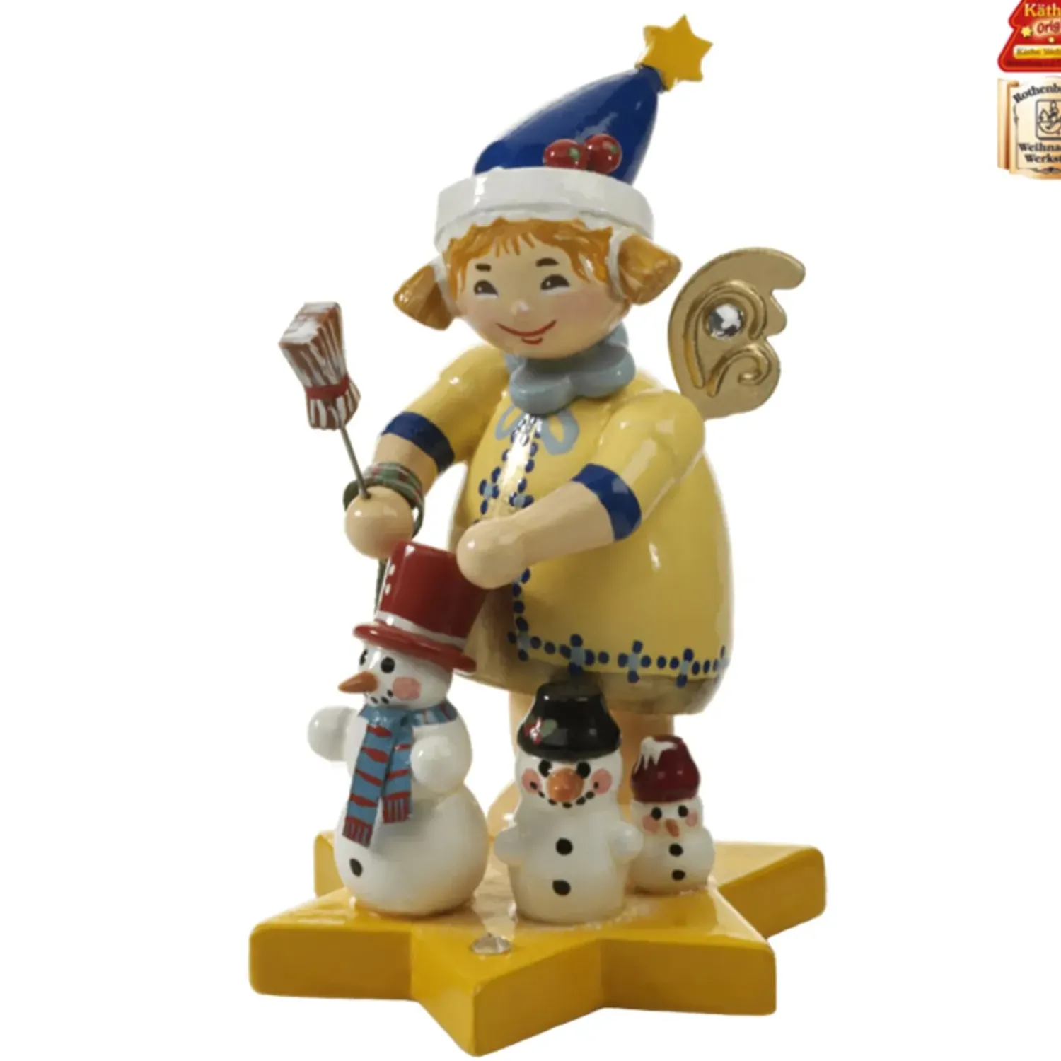 Wie Die Orgelpfeifen Stehen Die Hubschen Schneemanner Auf Dem Himmelsstern. Das Niedliche Engelmadchen Mit Einer Blauen Weihnachtsmutze Hat Sichtlich Freude Am Schneemannbauen. Knopfe Aus Schwarzen Steinen, Nasen Aus Karotten, Hute Oder Mutzen Und Schals Durfen Bei Keinem Schneemann Fehlen. Fehlt Nur Noch Der Typische Reisigbesen Fur Den Grosten Schneemann. Das Engelchen Bringt Auch Zu In Ihr Zuhause Eine Frohliche Winterstimmung!